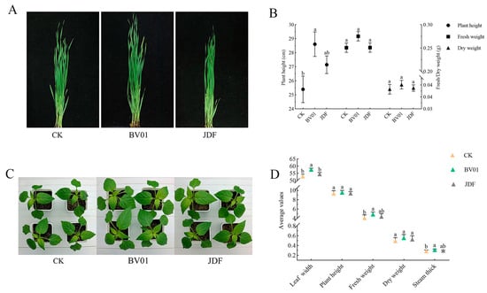 Growth-promotion effects of BV01 and JDF on wheat and pepper. Wheat growth (A) and experimental conditions (B) in CK, BV01, and JDF pot experiments, n = 12 plants. Pepper growth (C) and experimental conditions (D) in CK, BV01, and JDF pot experiments, n = 9 plants. Values are the means ± SEs, different letters show significant differences (Fisher’s LSD, p < 0.05).