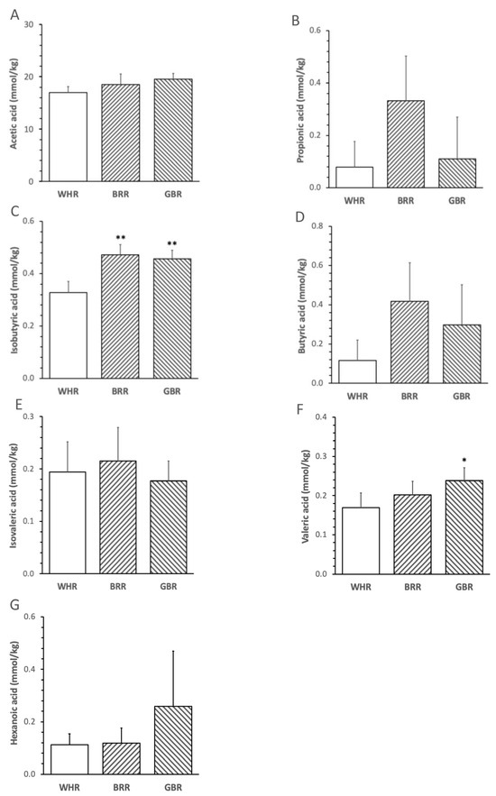 The abundance of fecal isobutyric acid in mice treated with an HF diet supplemented with 26 g% of BRR or GBR was significantly higher than that in mice treated with an HF + 26% of WHR (p < 0.01, Figure 1D). The levels of valeric acid in HF+GBR-, but not HF+BRR-, diet-fed mice were significantly higher than those in mice receiving HF+WHR diet (p < 0.05, Figure 1E). No significant difference in fecal acetic acid, propionic acid, butyric acid, isovaleric acid or hexanoic acid was detected among the three groups of mice (Figure 1).