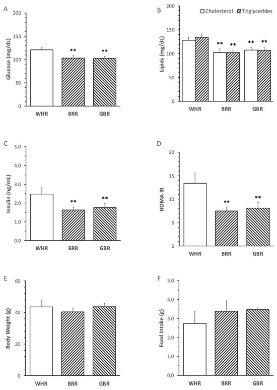 The levels of FPG, cholesterol, triglycerides, insulin and HOMA-IR in mice receiving an HF diet supplemented with BRR or GBR were significantly lower than those in mice fed with an HF diet supplemented with the equal dosage of WHR (p < 0.01). No significant difference in the metabolic variables was detected between mice receiving HF+BRR and HF+GBR diet (Figure 2A–D). Body weight and food intake were not significantly different among the three groups (Figure 2E,F).