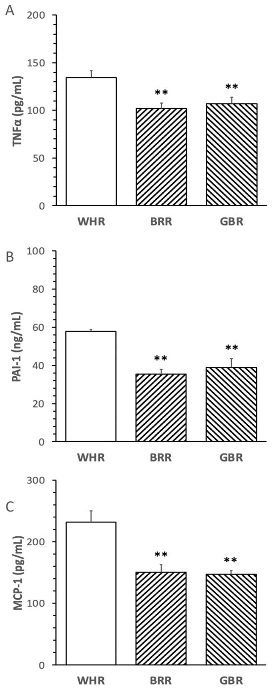 Influence of BRR and GBR on inflammatory markers in plasma of mice receiving HF diet. The dietary regimen of the animal experiment was identical to that described in the legend of Figure 1. The levels of inflammatory markers: (A) tumor necrosis factor-α (TNFα); (B) plasminogen activator inhibitor-1 (PAI-1); (C) monocyte chemotactic protein-1 (MCP-1) in plasma collected at the end of the dietary experiment were determined. Values were expressed in means ± SD (n = 5/group). **: p < 0.01 versus WHR group.