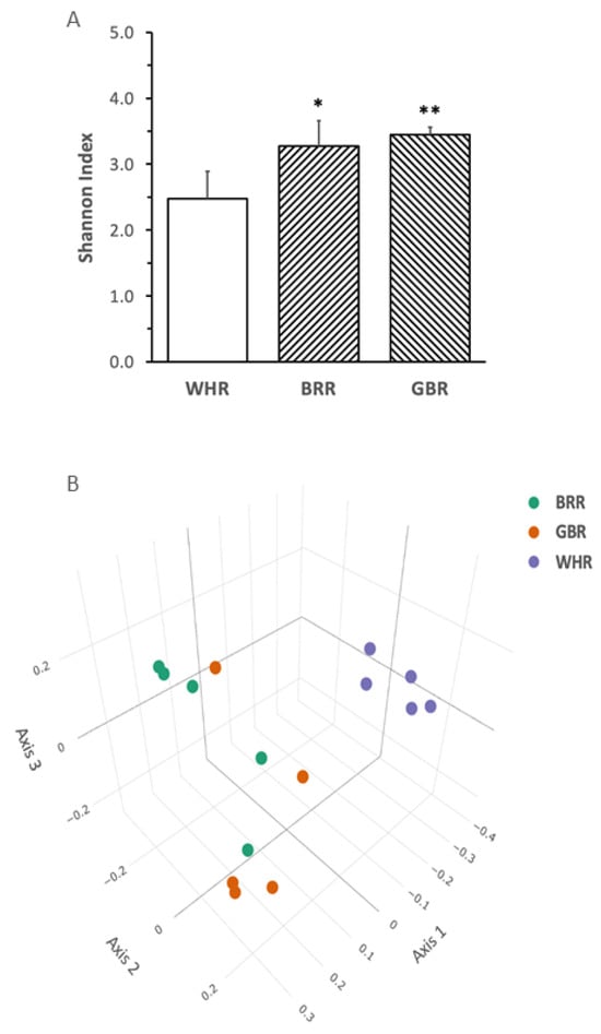 BRR or GBR supplementation significantly increased the Shannon index α-diversity of gut microbiota (Figure 5A). The principal coordinate analysis plot demonstrated that the gut microbiota in mice fed with HF+BRR or HF+GBR diet was completely separated from that in the HF+WHR group. Partial overlap in the β-diversity of gut microbiota in mice receiving HF+BRR and HF+GBR diet was detected as expected (Figure 5B).