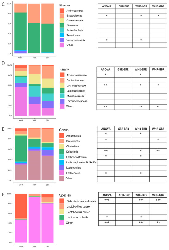 The abundances of fecal Bacteroidates phylum bacteria in mice fed with an HF diet supplemented with BRR or GBR were significantly higher than those in HF+WHR-diet-treated mice (p < 0.05). The levels of Verrucomicrobia phylum bacteria in mice receiving HF+BRR, but not HF+GBR, diet were significantly lower than those in HF+WHR-fed mice (p < 0.05, Figure 5C). The abundance of Akkermansiaceae family bacteria in mice fed with HF+BRR diet was significantly lower than that in mice receiving HF+WHR diet (p < 0.05). The abundance of Lachnospiraceae family bacteria in mice fed with an HF diet supplemented with BRR or GBR was significantly higher than that in mice fed with HF+WHR diet (p < 0.05, Figure 5D). The abundance of Akkermansia genus bacteria in mice receiving HF+BRR diet was significantly lower than that in mice fed with HF+WHR diet. The abundance of Bacteroides genus bacteria in HF+GBR-diet-treated mice was significantly greater than that in HF+WHR-diet-fed mice (p < 0.01). The abundances of Dubosiella genus bacteria in mice treated with diet containing BRR or GBR were significantly lower than those in mice receiving HF+WHR diet (p < 0.05 or 0.01). The abundances of Lachnoclostridium and Lactococcus genus bacteria were significantly higher in the feces of mice receiving HF+BRR diet (p < 0.05) compared to HF+WHR diet (p < 0.05, Figure 5E). The abundance of Dubosiella newyorkensis species bacteria in the feces of mice fed with HF+BRR or HF+GBR diet was significantly lower than that in mice receiving HF+WHR diet (p < 0.001). The abundance of Lactococcus lactis species bacteria in mice fed with HF+BRR diet was significantly higher than that in HF+WHR-diet-treated mice (p < 0.05, Figure 5F).