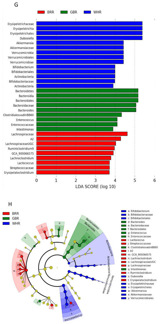 Effects of BRR and GBR on the composition of gut microbiota in HF-diet-fed mice. The dietary regimen of the animal experiment was identical to that described in the legend of Figure 1. Feces were collected from cages of individually hosted mice on last day of the dietary experiment. Fecal bacteria gene sequencing as described in the Methods section. (A): Shannon Index (α-diversity) values were expressed in means ± SD (n = 5/group), *, **: p < 0.05 or 0.01 versus WHR group; (B): principal component analysis (ß-diversity); (C): phylum bacteria, (D): family bacteria; (E): genus bacteria; (F): species bacteria; (G,H): liner discriminant analysis effect size of gut microbiota. Figure captions in Figure 5C–F: ANOVA: significance among the three groups; GBR-BRR, WHR-BRR, WHR-GBR: significance between the two groups using post-hoc test. *, ** or ***: p < 0.05, 0.01 or 0.001.