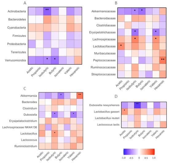 The following associations between fecal SCFAs and gut bacteria were detected. The abundances of fecal isobutyric acid negatively correlated with those of Actinobacteria and Verrucomicrobia phylum bacteria in the mice (p < 0.05 or 0.01). The abundance of butyric acid negatively corrected with fecal Verrucomicrobia (p < 0.05, Figure 6A). The levels of acetic acid positively correlated with Lactobacillaceae family bacteria (p < 0.05). The abundances of isoburyric acid positively correlated with Lachnospirceae, but negatively correlated with Akkermansiaceae and Erysipelotrichaceae family bacteria (p < 0.05). The levels of butyric acid negatively correlated with fecal Akkermansiaceae family bacteria. The abundance of valeric acid positively correlated with Lachnospiraceae, but negatively correlated with Erysipelotrichaceae family bacteria (p < 0.05). The abundance of hexanoic acid positively correlated with Peptococcaeae family bacteria (p < 0.01, Figure 6B). The levels of fecal isobutyric acid positively correlated with fecal Lactobarcillus and negatively correlated with Dubosiella genus bacteria (p < 0.05). The abundance of butyric acid negatively correlated with Akkermansia genus bacteria (p < 0.01). The abundances of valeric acid were negatively correlated with Dubosiella genus bacteria (p < 0.05). The abundance of hexanoic acid positively correlated with Akkermansia genus bacteria (p < 0.01, Figure 6C). The abundance of isobutyric acid negatively correlated with Dubosiella newyorkensis species bacteria in mouse feces (p < 0.01). The abundance of acetic acid positively correlated with Lactobacillus gasseri, a species of commonly used probiotic bacteria (p < 0.05, Figure 6D).