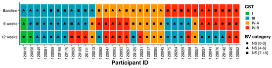 Composition of bacterial species and transitions within bacterial communities over the 12–week period. Box plots showing CSTs assigned to individual participants over 3 time points at baseline, 6 weeks, and 12 weeks. Green color depicts CST I, blue CST III, orange CST IV–A, and red CST IV–B.