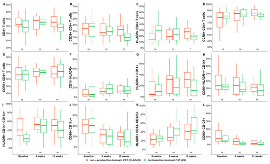Frequencies of cervical T-cell and DC subsets in women with a cervicovaginal microbiota dominated by Lactobacillus spp. (predominantly L. iners, red) and non-Lactobacillus at baseline, 6 weeks, and 12 weeks after initiating MDZ. Graphs show the differences between pre- and post-MDZ initiation for the frequencies of cervical: Graph shows the differences over time for the frequencies of cervical (A) CD4+ T cells, (B) CD38+ CD4+ T cells, (C) HLADR+ CD4+ T cells, (D) CCR5+ CD4+ T cells, (E) CCR6+ CD4+ T cells, (F) CD14− HLADR+, (G) HLADR++ CD14+, (H) CD86+ HLADR++ CD14+, (I) HLDR+ CD14− CD11c+, (J) CD86+ CD11c+, (K) HLADR+ CD14− CD123+, and (L) CD86+ CD123+. Red color depicts non-Lactobacillus dominant CST (IV-A/IV-B) and red depicts Lactobacillus dominant CST (I/III). Statistical comparisons were performed using Mann–Whitney U tests for unmatched data or the Kruskal–Wallis test with false discovery rate correction for cross-sectional data. * Indicates significant differences (p < 0.05), while ns indicates non–significant difference (p > 0.05).