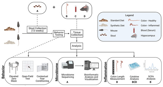 Mouse fecal samples were collected weekly for gut microbiome analysis to monitor changes in bacterial diversity over the course of the feeding period, as well as differential taxa abundance and hypothesized metabolic pathway alterations at the conclusion of the feeding period. Fecal samples were collected weekly to better understand how soon after starting one of two diet conditions changes begin to be observed and how these trends change longitudinally. Following 13 weeks of diet consumption, behavioral tests were then conducted, including an open-field test, elevated zero maze, and contextual fear conditioning. Mouse colon, blood, and hippocampal tissue were then harvested, snap-frozen in dry ice, and stored at −80 °C until further processing. Subsequent analyses of tissues examined the effects of consuming a synthetic diet on colon length, cytokine levels, and SCFA levels. Details of experimental protocols are provided in Figure 1.
