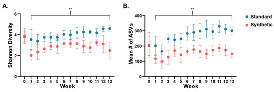 Changes in diversity of the gut bacterial microbiome in the two feeding groups were assessed throughout the feeding period (Figure 2). Alpha diversity was determined through calculation of the Shannon diversity index (Figure 2A), and by counts of observed number of ASVs for each sampling point (weeks 0–13) (Figure 2B). At weaning (week 0), there was no significant difference in mean Shannon diversity (Synthetic x = 3.882, Standard x = 3.795, t-test p = 0.875). However, significant differences were detected after the first week compared to Week 0 and continued throughout the course of the study (Figure 2), such that by week 13, the synthetic diet group was significantly less diverse (Synthetic x = 2.485, Standard x = 4.595, t-test p ≤ 0.001). A similar result was obtained through counts of unique ASVs, with no difference found at weaning (Synthetic x = 205.333, Standard x = 202, t-test p = 0.959) and significantly less observed ASVs by week 13 (Synthetic x = 148.9, Standard x = 301.3, t-test p ≤ 0.001).