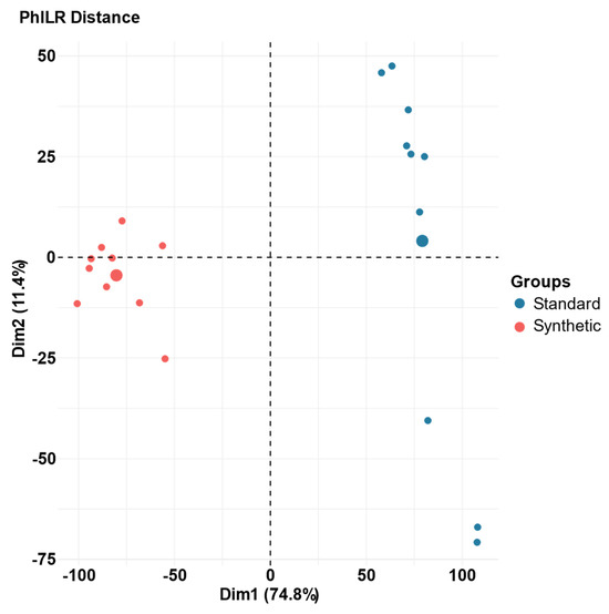 The gut microbial community composition of the synthetic diet and standard diet animals at week 13 was compared using principal component analysis (PCA). Phylogenetic isometric log-ratio (PhILR) transformed distances was utilized to produce the PCA plots (Figure 3) [46]. At week 13, there is no overlap between samples in the two groups, indicating a dramatic shift in the composition of the gut microbiome caused by the synthetic diet. PERMANOVA determined that the impact of the deviance based on diet (synthetic vs. standard) was statistically significant (R2 = 0.56, p = 0.001), explained 56% of variance [48].