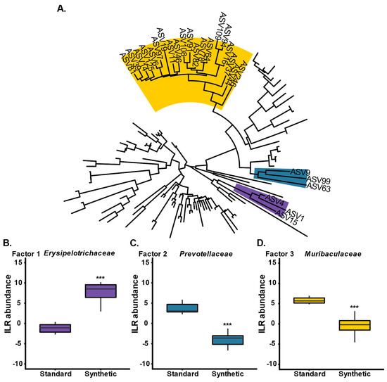 Phylofactorization of all bacterial ASVs present in stool samples from mice fed either a synthetic or standard diet at week 13 (n = 10 per group) (A). Three factors (family clades) were identified as drivers of variation between the two diet groups: (B) Erysipelotrichaceae (purple), (C) Prevotellaceae (blue), and (D) Muribaculaceae (yellow). (*** p ≤ 0.001).