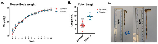 Mouse body weights and colon length measurements of mice fed the synthetic diet or the standard diet after 13 weeks (n = 10 per group). Body weight for all mice was measured weekly throughout the 13-week feeding period (A). Synthetic diet animals (7.85 cm ± 0.65) had a significantly shorter colon than that of standard diet animals (9.83 cm ± 0.48), p = 2.65 × 10−7 (B). Representative photos of colons dissected from a synthetic diet animal (C—left) and a standard diet animal (C—right). (*** p ≤ 0.001).