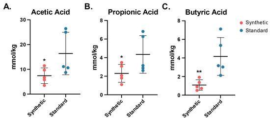 Acetic acid was significantly lower in the synthetic diet group than the standard diet group (7.43 ± 3.17 vs. 6.39 ± 8.58, one-tailed t-test p = 0.04). Propionic acid concentrations were also found to be significantly lower in the synthetic diet animals (2.31 ± 0.96 vs. 4.34 ± 2.02, one-tailed t-test p = 0.04). Butyric acid concentrations were significantly lower in the synthetic diet animal samples as well (1.09 ± 0.56 vs. 4.16 ± 2.04, one-tailed t-test p = 0.01).