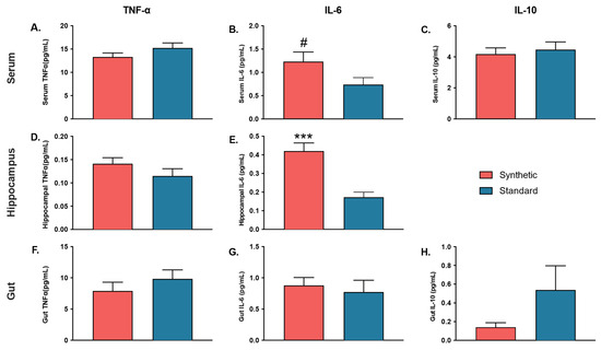 Cytokine (TNF-α, IL-6, IL-10) quantification in the serum (n = 10 per group), hippocampus tissue lysate (brain) (n = 10 per group), and colon tissue lysate (gut) (n = 5 per group). (A) Serum TNF-α; (B) Serum IL-6; (C) Serum IL-10; (D) Hippocampal TNF-α; (E) Hippocampal IL-6; (F) Gut TNF-α; (G) Gut IL-6; (H) Gut IL-10. Hippocampal IL-10 was excluded. Bars represent ± SEM. # p ≤ 0.10; (*** p ≤ 0.001).