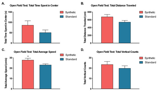 Open Field Test. An independent samples t-test was used to compare behavior in the open field chamber between animals fed synthetic diet (coral) and a standard diet (blue) (n = 10 per group) for (A) total time spent in the center zone, (B) total distance traveled, (C) total average speed, and (D) total vertical counts. Although all cases revealed higher average values for synthetic diet fed mice, only total average speed (C) was significantly different. (* p ≤ 0.05).