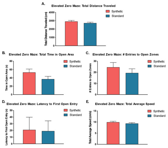 Elevated Zero Maze (n = 10 per group). (A) Total distance traveled in synthetic and standard diet animals; (B) Total time in open areas; (C) Number of entries into the open areas or zones; (D) Latency to first entry into an open zone; (E) Total average speed. No significant differences were detected by independent samples t-tests.