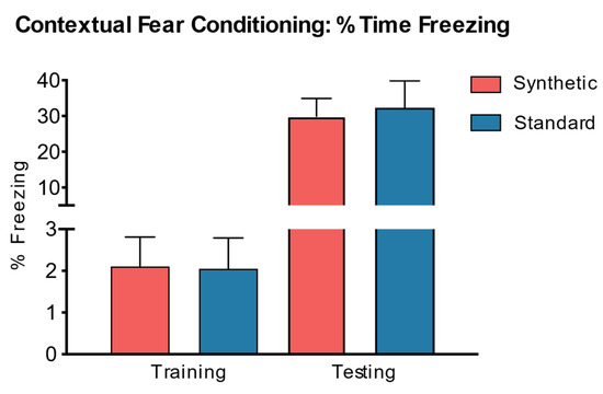 Cognitive function was assessed using the contextual fear conditioning method. An independent samples t-test was also performed to assess the effects of the synthetic diet on learned freezing behaviors (Figure 10). The results revealed no significant difference in freezing behavior on testing day (t(18) = −0.26, p = 0.81) and training day (t(18) = −0.06, p = 0.96) between mice fed the synthetic diet and mice fed the standard control diet.