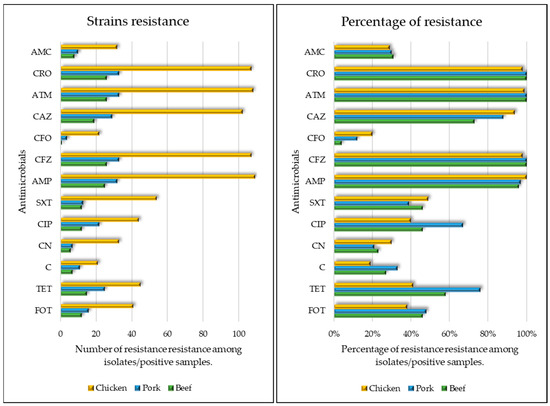 Comparative antimicrobial susceptibility profile across beef, chicken, and pork samples. On the left a figure relating to the number of isolates per meat sample and on the right a figure relating to the percentage of resistance per meat sample. FOT—fosfomycin-trometamol; TET—tetracycline; SXT—trimethoprim-sulfamethoxazole; C—chloramphenicol; CN—gentamicin; CIP—ciprofloxacin; AMC—amoxicillin-clavulanic acid; AMP—ampicillin; CFZ—cefazolin; CFO—cefoxitin; CRO—ceftriaxone; CAZ—ceftazidime; ATM—aztreonam.