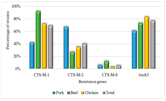 Among ESBL strains, the blaCTX-M-1 gene was the most prevalent, consistent with findings from prior studies [48,83] and corroborated by a European study [84]. Remarkably, the predominance of CTX-M-1 genes was observed in beef samples, although beef is not typically regarded as a primary indicator of antimicrobial resistance [40,85,86,87]. Conversely, pork strains presented more blaCTX-M-2 genes, highlighting the critical importance of detecting and characterizing strains that produce β-lactamase enzymes, as they provide insights into the epidemiological distribution of these genes. Such insights hold significant relevance in the context of antimicrobial resistance, an issue that has consequences for animal, human, and environmental health.