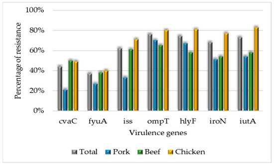 Percentage of virulence genes detected in beef, chicken, and pork strains.