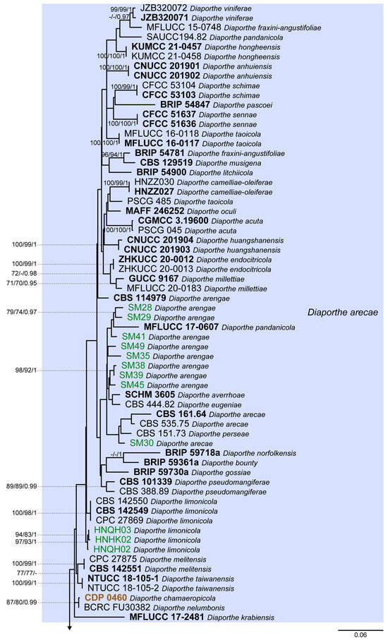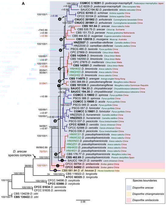 Diaporthe arecae was introduced by Srivastava et al. [38] as Subramanella arecae associated with a severe post-harvest fruit rot of Areca catechu in India. The species was later assigned to Diaporthe based on an ex-isotype culture by Gomes et al. [24]. However, these authors revealed that most loci used to infer the phylogenetic relationships in Diaporthe failed to resolve the phylogenetic position of D. arecae and its related species. Later, based on morpho-molecular analyses, Tan et al. [39] introduced three new closely related species to D. arecae, but they showed low bootstrap support values. The problematic clade was first designated as the D. arecae species complex by Huang et al. [35], who isolated 13 endophytic strains from Citrus spp. in different provinces of China that were clustered in a poorly supported clade with the ex-isotype strain of D. arecae. Huang and co-workers were the first to recognize that the species boundaries within the DASC should be carefully re-evaluated, so they “refrained from defining novel taxa within the complex” [35]. Although a few authors have followed the same strategy [40], over the years more than 40 species, including important phytopathogens, distributed worldwide, have been introduced in the DASC. For instance, Guarnaccia and Crous [10] introduced D. limonicola and D. melitensis in the DASC as a devasting dieback disease affecting Citrus in Europe. Contrarily, minor pathogens, such as D. pescicola and D. taoicola [41] and D. guangxiensis and D. viniferae [21], were introduced in the same species complex associated with dieback symptoms in Prunus persica and Vitis vinifera in China, respectively. Moreover, D. oculi and D. pseudooculi were introduced to the DASC by Ozawa et al. [42] as human pathogens causing eye diseases. This evidence suggests that the ecology of the DASC is complex and may include, besides phytopathogens, some species involved in human invasive infections.