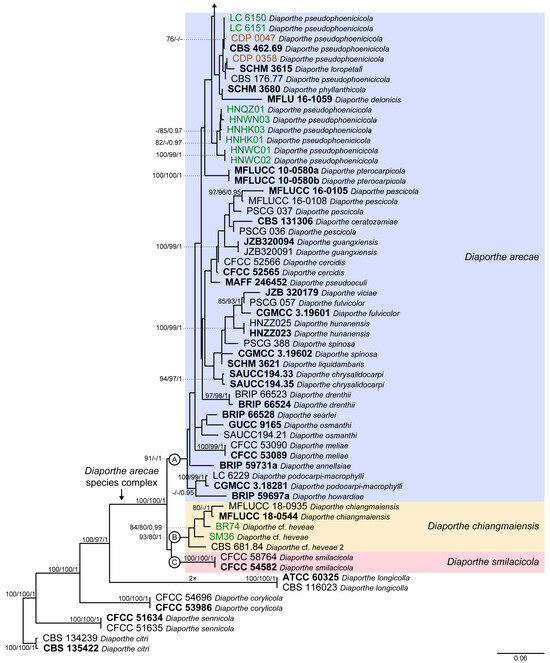Phylogenetic tree generated from maximum likelihood analysis based on combined ITS, tef1, tub2, cal and his3 sequence data for the Diaporthe arecae species complex and related species. Bootstrap support values for maximum likelihood, maximum parsimony (ML-BS/MP-BS ≥ 70%) and Bayesian posterior probabilities (PP ≥ 0.90) are shown at the nodes. Strains with type status are indicated in bold font. The isolates from this study are presented in brown typeface and the additional isolates from palm tissues included in the analyses are presented in green typeface. Species boundaries within the D. arecae species complex are delimited by colored blocks and their respective branches are indicated by lettered circles (A–C). The scale bar represents the expected number of nucleotide changes per site. The tree is rooted to D. citri (CBS 134239 and CBS 135422).
