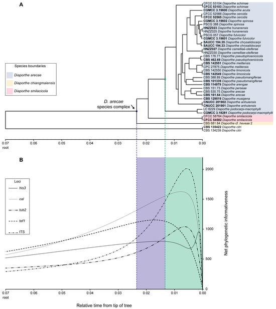 Phylogenetic informativeness profiles of the Diaporthe arecae species complex and related species through a relative time scale for a combined dataset of five loci (ITS, tef1, tub2, cal and his3). (A). Time tree inferred by applying the RelTime-ML method. All divergence times shown are relative times as no calibrations were used. Strains with type status are indicated in bold font. Species boundaries within the D. arecae species complex are delimited by colored blocks and referred to in the chart legend. The tree is rooted to D. citri (CBS 134239 and CBS 135422). (B). Net phylogenetic informativeness profiles in arbitrary units matched to the time tree scale with lines representing individual loci profiles and referred to in the chart legend. Nodes of interest are highlighted by blue and green dots and dashed lines through both panels, and the corresponding graph areas are emphasized by colored blocks.