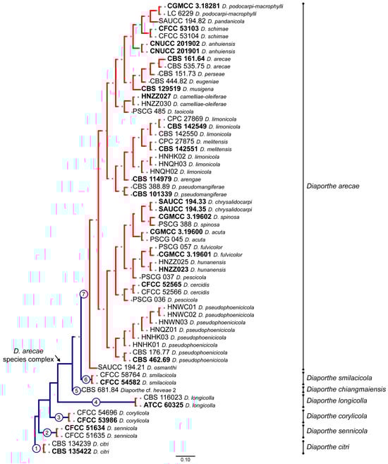 Maximum-likelihood species delimitation scheme obtained from the Poisson tree process (PTP) analysis of the Diaporthe arecae species complex and related species, based on combined dataset of 5 loci (ITS, tef1, tub2, cal and his3). Blue-colored branches illustrate the speciation process and red-colored branches illustrate the coalescent/population process. Putative species clusters are represented as transitions from blue-colored to red-colored branches or as terminal, blue-colored branches and are highlighted by numbered circles (1–7). Strains with type status are indicated in bold font. The scale bar represents the expected number of nucleotide changes per site.