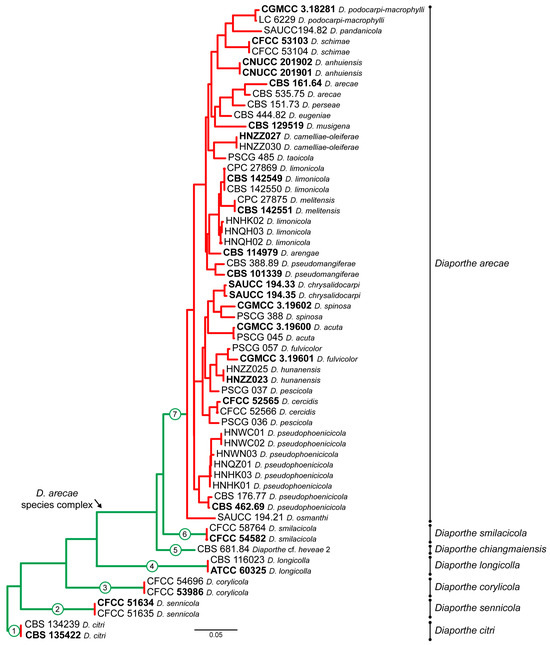 Maximum-likelihood species delimitation scheme obtained from the multi-rate Poisson Tree Process (mPTP) analysis of the Diaporthe arecae species complex and related species, based on combined dataset of 5-loci (ITS, tef1, tub2, cal and his3). Green-colored branches illustrate the speciation process and red-colored branches illustrate the coalescent process. Putative species clusters are represented as transitions from green-colored to red-colored branches or as terminal, green-colored branches and are highlighted by numbered circles (1–7). Strains with type status are indicated in bold font. The scale bar represents the expected number of nucleotide changes per site.