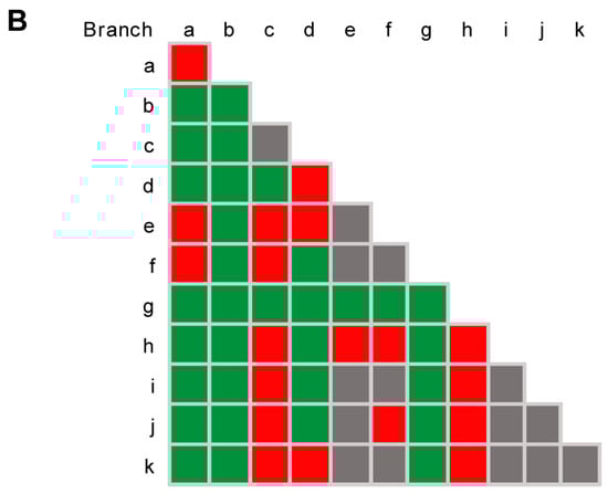 Nonetheless, many other paired branches tested positive for recombination without significant recombination within the branches themselves (Figure 6B). For instance, significant recombination was found among taxa from branch a (isolated from five different hosts and three countries) and the species D. osmanthi (branch i, isolated from Litchi chinensis in China) (p = 1.40 × 10−5); among taxa from branch d (isolated from Citrus limon in Malta and Areca catechu in China) and the species D. pseudomangiferae (branch f, isolated from Mangifera indica in Mexico and Dominican Republic) (p = 3.86 × 10−2) and D. osmanthi (branch i) (p = 4.53 × 10−2); and among taxa from branches a and c (isolated from Camellia oleifera and Pyrus pyrifolia) and the species D. pseudophoenicicola (branch h, isolated from A. catechu in China, M. indica in Iraq and Phoenix dactylifera in Spain) (p = 1.00 × 10−2 and 2.00 × 10−3, respectively) (Figure 6). Significant recombination was also detected between D. chiangmaiensis (branch k, isolated from Heveae brasiliensis in India) and D. smilacicola (branch j, isolated from Smilax glabra in China) and taxa from branch a (p = 9.80 × 10−4 and 1.90 × 10−2, respectively), as well as between D. smilacicola and taxa from branch d (p = 2.76 × 10−2) (Figure 6).