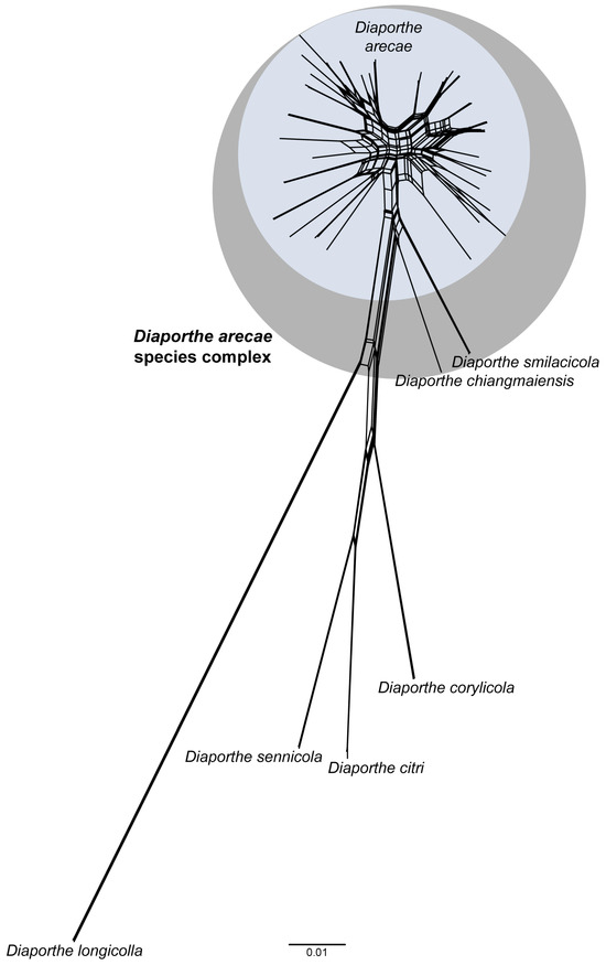 The phylogenetic network analyses were congruent with the previous phylogenetic inferences and the GCPSR principle, regarding the existence of three distinct species within the DASC. While the networked relationships among taxa of the D. arecae subclade appear to exhibit inherently non-treelike evolutionary events, the relative distance and phylogenetic network structure of the branches corresponding to D. chiangmaiensis (subclade B in Figure 1) and D. smilacicola (subclade C in Figure 1) seem to clearly approach a bifurcated evolutionary relationship without conflicting phylogenetic signals, i.e., without recognition of expressive recombination.