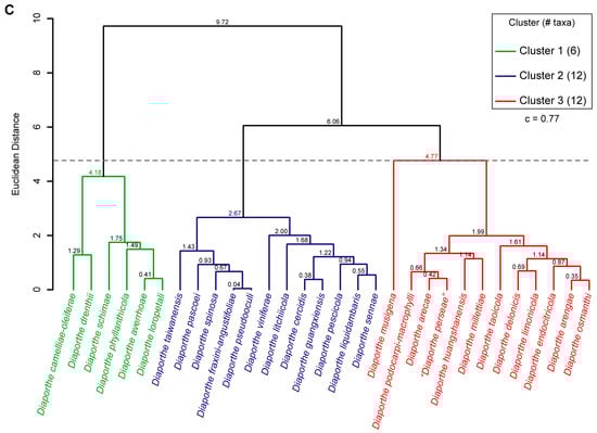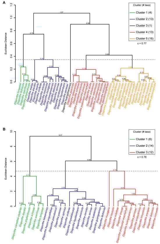 To assess the correlation between species phylogenetic boundaries and taxa morphology, measurements of the length and width of alpha and beta conidia of all species belonging to the DASC with published taxonomic descriptions were used. A hierarchical cluster analysis (HCA) was conducted using R Statistical Software version 4.3.1 [98]. Pairwise distance among taxa were estimated using Euclidean distance index to generate the dissimilarity matrices, and dendrograms were constructed by the unweighted pair group method with arithmetic mean (UPGMA) as the clustering algorithm. Dendrograms were generated using the following R packages: cluster version 2.1.4 [99], factoextra version 1.0.7 [100] and dendextend version 1.17.1 [101]. The optimal number of clusters was determined using the R package nbclust version 3.0.1 [102] according to the majority rule approach. Goodness-of-fit of the dendrograms was evaluated by means of the cophenetic correlation coefficient (c) [103]. Dendrograms were generated based on the length-to-width (L/W) ratios of alpha and beta conidia. These were calculated for all taxa following Equation (1) to standardize and make the data comparable among taxa.