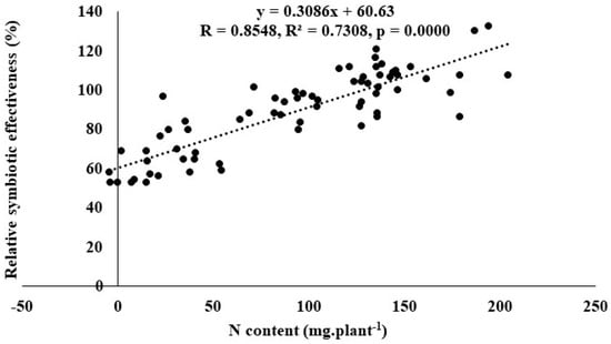 Correlation and regression analysis between N content and relative symbiotic effectiveness of jack bean inoculated with rhizobia from diverse locations (Luve, KaZulu and Malkerns Research Station) in Eswatini.