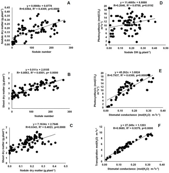 Correlation and regression analysis between (A) nodule number and nodule biomass, (B), nodule number and shoot dry matter, (C) nodule biomass and shoot dry matter, (D) nodule and photosynthesis, (E) stomatal conductance and photosynthesis and (F) stomatal conductance and transpiration of jack bean inoculated with rhizobia from diverse locations (Luve, KaZulu and Malkerns Research Station) in Eswatini.