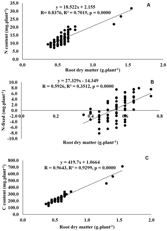 Correlation and regression analysis between (A) root dry matter and root N content, (B) root dry matter and root N-fixed and (C) root dry matter and root C content of jack bean inoculated with rhizobia from diverse locations (Luve, KaZulu and Malkerns Research Station) in Eswatini.