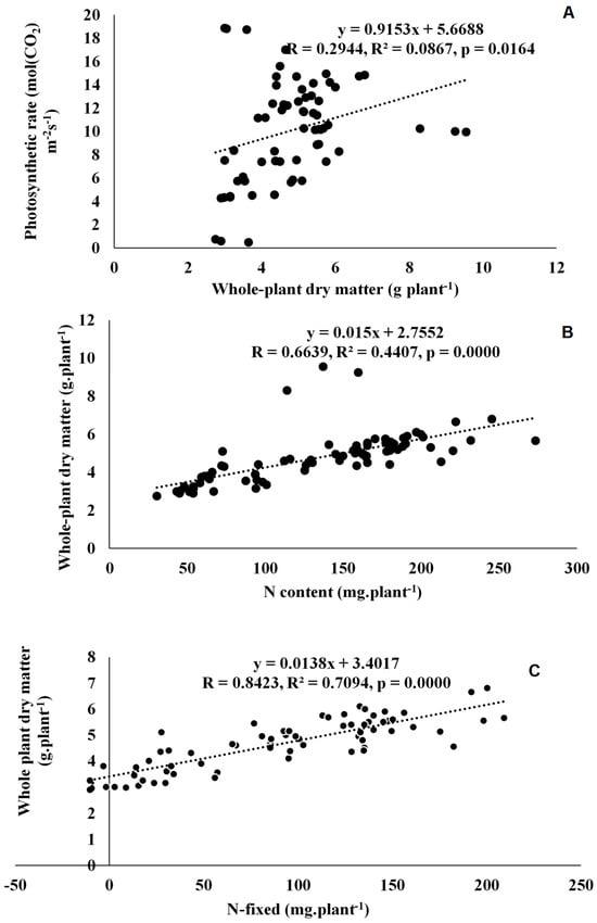 Correlation and regression analysis between (A) photosynthetic rate and whole-plant DM, (B) photosynthetic rate and whole-plant N content and (C) whole-plant DM and whole-plant N fixation of jack bean inoculated with rhizobia from diverse locations (Luve, KaZulu and Malkerns Research Station) in Eswatini.