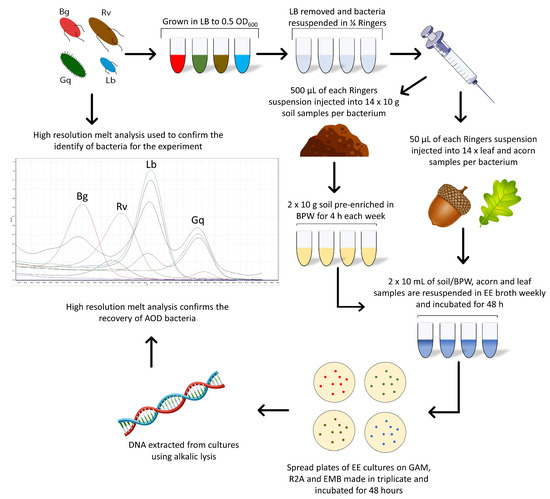 Each microcosm was inoculated in duplicate for each bacterial species in a series of seven, one for each week of the experiment and the 0 h time point. Two acorn, leaf and soil samples remained uninoculated throughout the experiment to act as a control. Following the initial spiking of all microcosms, a 0 h time point measurement was taken for each sample to ensure that bacteria were not lost upon inoculation. All microcosms were stored at 8 °C, the average annual UK forest temperature [24]. One series of microcosms was removed weekly for enriched recovery of the AOD bacteria during the six-week experiment. Figure 1 details this method, leading into the enrichment method.