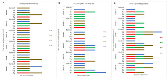 The identities of AOD-associated bacteria recovered from the three inoculated niches, (A) indicates the identifications made in soil, (B) acorns and (C) leaves. The inoculum of each species was adjusted to an OD600 of 0.5, which was added to each substrate sample except the controls, to which 1 mL of sterile ¼ strength Ringers was added. Isolation from each sample type took place at weekly intervals over the course of six weeks before identification by HRM in triplicate. Re-isolations are separated by week and the initial inoculated bacteria. Identifications that do not match the original species that were inoculated into spiked substrates can be seen in a number of the columns and the control samples, indicating that AOD bacteria were already present in the majority of samples.