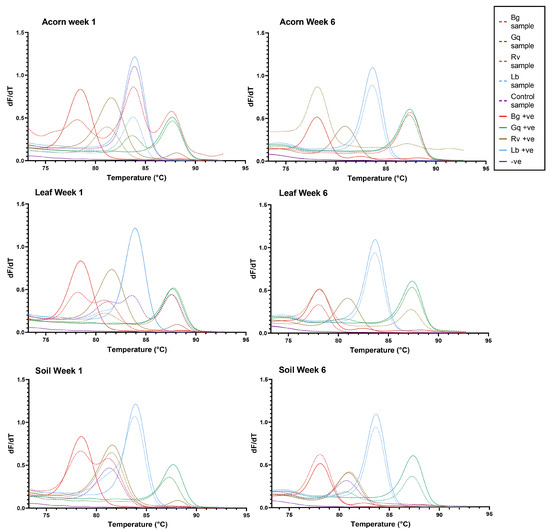 The HRM curves generated for each microcosm at week 1 and week 6 of the experiment. From left to right, the coloured peaks indicate the presence of B. goodwinii (Bg), R. victoriana (Rv), L. britannica (Lb) and G. quercinecans (Gq). Solid colour lines represent positive controls, while dashed lines represent samples.