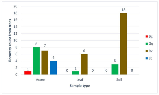 Following the isolation of bacteria with the EE broth method from leaves, acorns and soil samples from Hatchlands Park, multiplex HRM was performed in triplicate to confirm the identity of the isolates. Figure 5 demonstrates the number of times each species was identified from each sample type, while Supplementary Table S3 lists the specific species identifications from each sample.