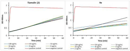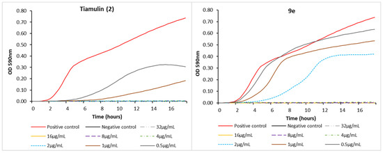 To investigate the kinetics of the antibacterial activity exhibited by 9e and tiamulin (2), real-time growth inhibition curves were determined against S. aureus ATCC 25922 and P. aeruginosa PAO1 via measurement of optical density at 490 nm during an 18 h culturing period. Although appearing to be qualitatively different, both compounds inhibited the growth of S. aureus (Figure 3), with the 18 h time point values in close agreement with the MIC values obtained for the two compounds (Table 1) using classical microdilution techniques. Further investigation is required to determine the factors leading to the differences observed in the sub-MIC growth curves for the two compounds. No such inhibition was observed against P. aeruginosa (Figure S8).