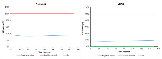 The mechanism of antibiotic action of 9e towards the Gram-positive bacterium Staphylococcus aureus was attributed to its ability to disrupt the bacterial membrane and cause the release of intracellular ATP. The test organisms, being S. aureus ATCC 25923 and MRSA, were briefly exposed to 9e at a single dose of 100 µg/mL, with the leakage of ATP determined by the use of a bioluminescence assay (Figure 4). While considered active in the assay, the level of disruption induced by exposure to 9e was significantly less than that induced by the positive control squalamine. Nevertheless, a 40% level of ATP release is detrimental to the survival of the bacteria. After 3 min, it will be clear that the bacteria will be killed.