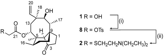 Tiamulin (2) was selected to be used as a positive control in biological assays and was prepared by a one pot, two-step sequence, whereby 22-O-tosylate 8 was preincubated with 2.0 equivalents of KI to give the 22-iodo derivative which was then reacted with 1.1 equivalents of 2-(diethylamino)ethane-1-thiol HCl salt in the presence of excess DIPEA to afford (2) in 47% yield (Scheme 1) (Figure S1).