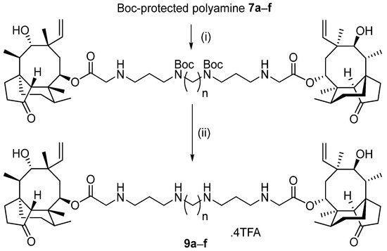 Regents and conditions: (i) Pleuromutilin O-22-tosylate (8) (2.0 equiv.), KI (2.2 equiv.), MeCN, 70 °C, 1.5 h, N2, then Boc-protected polyamine 7a–f (1.0 equiv.), and DIPEA (6 equiv.), 70 °C, 2.5 h, N2 (40–72%); (ii) TFA (0.2 mL), CH2Cl2 (2 mL), r.t., 2 h (47–99%).