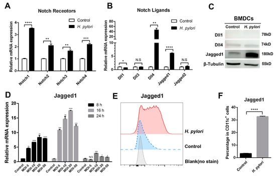 Expression profile of Notch molecules in BMDCs during H. pylori infection. BMDCs were stimulated with H. pylori (MOI 50) for 24 h. PBS was used as control for H. pylori. qRT-PCR was performed to assess the mRNA expression of (A) Notch receptors and (B) Notch ligands in BMDCs. Relative expression is normalized to β-Actin. (C) Western blot was performed to assess the protein levels of Dll1, Dll4 and Jagged1 in BMDCs. β-Tubulin was used as loading control. (D) BMDCs were stimulated with different MOI (5, 10, 20 and 50) of H. pylori for 8 h, 16 h or 24 h, and qRT-PCR was performed to assess the mRNA level of Jagged1. Flow cytometry was performed to measure the level of Jagged1 on BMDCs stimulated with H. pylori (MOI 20) for 16 h, and (E) the representative histogram plot and (F) the percentage were illustrated. The data are presented as the mean ± SD of three independent experiments. * p < 0.05, ** p < 0.01, *** p < 0.001, **** p < 0.0001, N.S: no statistical difference.
