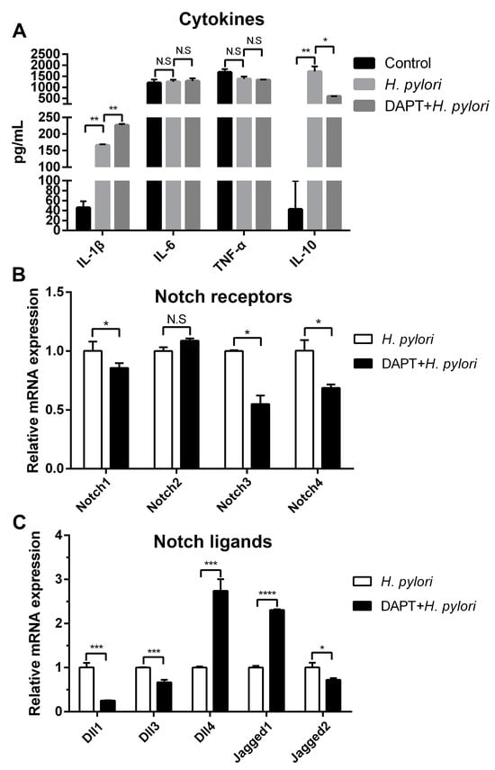Inhibition of Notch signaling influenced the production of cytokines in BMDCs during H. pylori infection. BMDCs were pretreated with DAPT (20 μM) for 24 h, and then stimulated with H. pylori (MOI 50) for 24 h. DMSO was used as control for DAPT. (A) ELISA was used to determine the level of IL-1β, IL-6, TNF-α and IL-10. qRT-PCR was performed to examine the mRNA expression of (B) Notch receptors and (C) Notch ligands. Relative expression is normalized to β-Actin. The data are presented as the mean ± SD of three independent experiments. * p < 0.05, ** p < 0.01 and *** p < 0.001, **** p < 0.0001, N.S: no statistical difference.