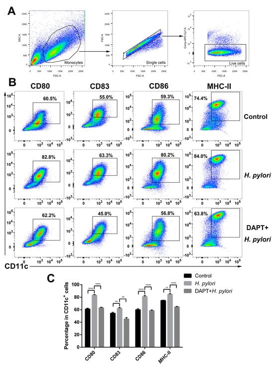 BMDCs were seeded on 6-well plates at a density of 1 × 106/mL and cultured in fresh medium supplemented with 10% fetal bovine serum at 37 °C in 5% CO2. H. pylori was directly added into the medium at a multiplicity of infection (MOI) of 50 CFU/cell as previously described [], and incubated with BMDCs for 24 h. In the control group, an equivalent volume of PBS was added into the uninfected wells. To block Notch signaling, BMDCs were pretreated with DAPT (20 μM) or equal volume of DMSO for 24 h before H. pylori stimulation.
