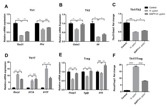 The mRNA expression profile of Th cells was reversed by DAPT in the co-culture system of H. pylori-infected BMDCs and CD4+ T cells. BMDCs pretreated in the presence or absence of DAPT (20 μM, 24 h) were stimulated with H. pylori (MOI 50, 24 h) and then co-cultured with splenic CD4+ T cells from syngeneic C57BL/6 mice for 72 h. The mRNA expression of characteristic transcription factors and cytokines of (A) Th1 (Tbx21, Ifnγ), (B) Th2 (Gata3, Il4), (D) Th17 (Rorγt, Il17A, Il17F) and (E) Treg (Foxp3, Tgfβ, Il10) was assessed using qRT-PCR. (C) The ratio of Tbx21/Gata3 and (F) Rorγt/Foxp3 is shown. Relative expression is normalized to β-Actin. The data are presented as the mean ± SD of three independent experiments. * p < 0.05, ** p < 0.01 and *** p < 0.001, **** p < 0.0001, N.S: no statistical difference.