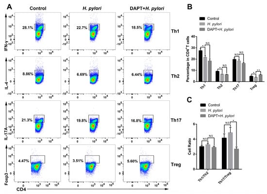 Previous studies have shown that Notch signaling is involved in the regulation of DC activation, thereby affecting DC-induced CD4+ T cell differentiation in inflammatory and infectious diseases []. However, whether Notch signaling plays a role in DC-medicated Th differentiation during H. pylori infection has not been reported. To target Notch signaling, BMDCs were pretreated with or without DAPT before H. pylori infection, and then co-cultured with CD4+ T cells generated from syngeneic C57BL/6 mice. The expression of characteristic transcription factors and hallmark cytokines of Th1 (Tbx21, Ifnγ), Th2 (Gata3, Il4), Th17 (Rorγt, Il17A and Il17F) and Treg (Foxp3, Tgfβ and Il10) was determined using qRT-PCR. The results showed that Rorγt, Il17A, and Il17F were simultaneously up-regulated after H. pylori stimulation (Figure 4D), while the transcription factors and cytokines of other Th cells decreased (Figure 4A,B,E). Except for Il17A, DAPT pretreatment partially reversed the changes induced by H. pylori. In addition, the ratio of Tbx21/Gata3 was down-regulated and the ratio of Rorγt/Foxp3 was up-regulated after H. pylori infection, whereas DAPT pretreatment reversed this change (Figure 4C,F). Subsequently, we performed flow cytometry to further detect the differentiation of CD4+ T cells (Figure 5A). In line with the mRNA level, the percentage of Th1, Th2, and Treg was down-regulated in H. pylori-pulsed BMDC group (Figure 5B). DAPT pretreatment elevated the percentage of Treg and had no effect on Th1 and Th2 (Figure 5B), which accounted for the decreased ratio of Th17/Treg (Figure 5C). Taken together, DAPT pretreatment in BMDCs shifted Th17/Treg balance toward Treg, revealing an important role of Notch signaling in CD4+ T cell differentiation during H. pylori infection.