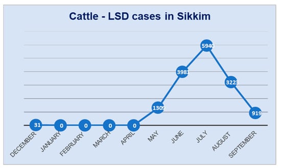 The line diagram showing the number of LSD cases recorded in cattle in the state of Sikkim during the years 2022–2023.