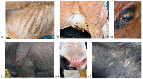 This figure illustrates the clinical signs observed in Cattle (a–c) and Yak (d–f), showcasing characteristic skin nodules in various regions. In cattle, nodules are visible on the (a) thoracic region, (b) hind limb and udder, and (c) upper eyelid. In yaks, nodules are evident on the (d) elbow joint, (e) muzzle and nasal mucosa, and (f) neck region.